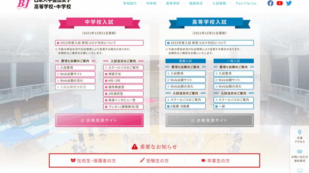 日本大学豊山女子中学校の学校説明会・イベント情報のご案内です。 学校説明会&入試報告会 3月12日 15:00~16:30 <日本大学豊山女子中学校 (にほんだいがくぶざんじょしちゅうがっこう )>