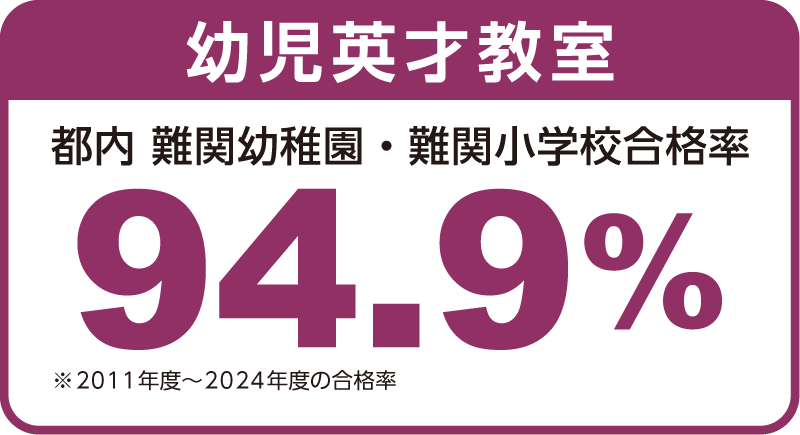 幼児英才教室には、難関私立小学校などの受験で94.9%と高い合格率の実績があります。親御様の希望をかなえる合格指導をします。