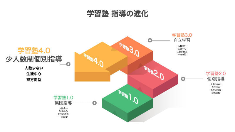 私たちは、その変化を4段階に捉えて「学習塾4.0」として最新の指導スタイルを「少人数制個別指導」を位置付けています。